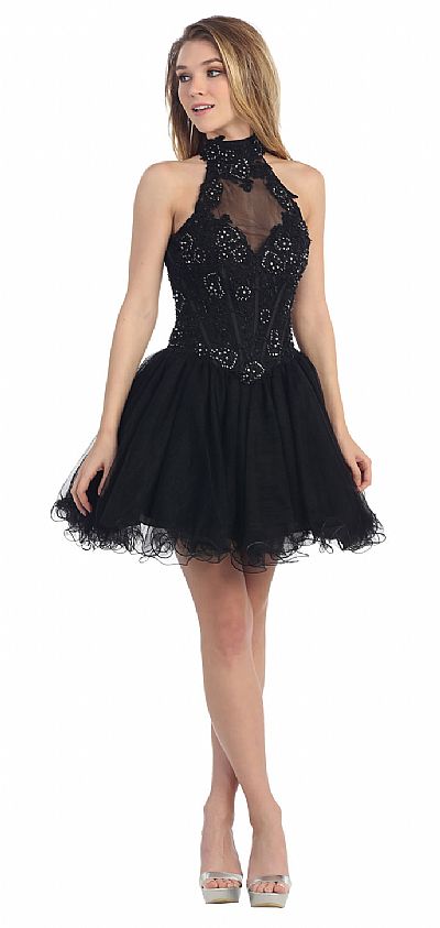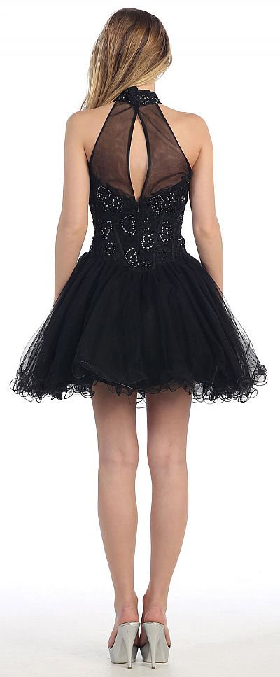 Halter Neck Lace Bodice Mesh Short Homecoming Party Dress. High neck with sheer mesh above the bust & beaded floral lace on the bodice all around. Big keyhole at back with sheer mesh & hook closure also. Layered ruffled hem puffy skirt in mesh with back zipper closure. Imported.