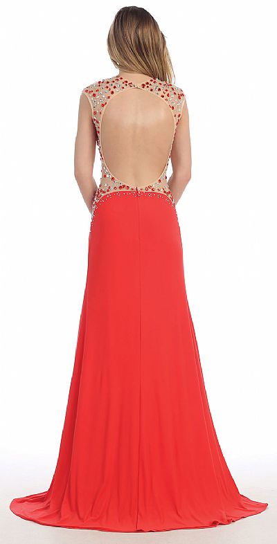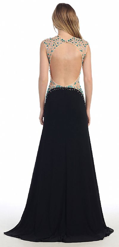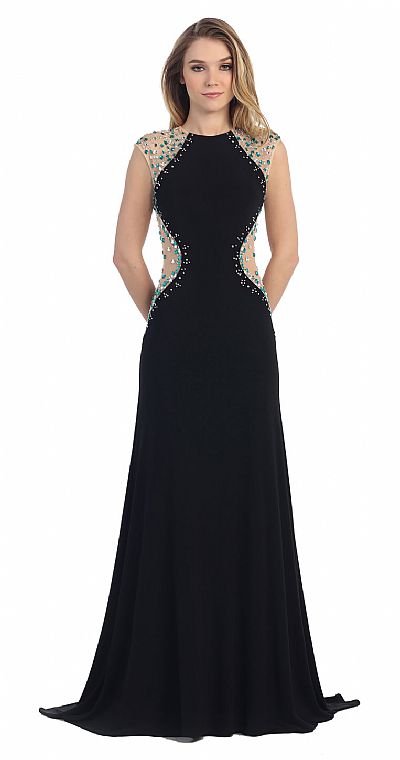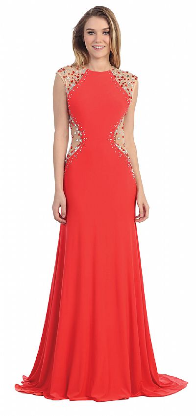 Mesh Rhinestones Bodice Floor Length Prom Pageant Dress. Round neck dress has mesh with big rhinestones on shoulders, side of waist & back also. Beading on solid fabric where mesh meets the dress. Floor length dress has little train with big keyhole at back with hook closure & zipper closure at skirt. Imported.