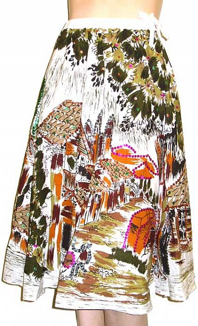 Full circle Tea-length skirt in Exquisite print. Paisley-inspired motif is sequined. Coordinating hues combined together as background gives this skirt a great look; made of 100% cotton. Side zipper; washable. 28 inches length. Imported.