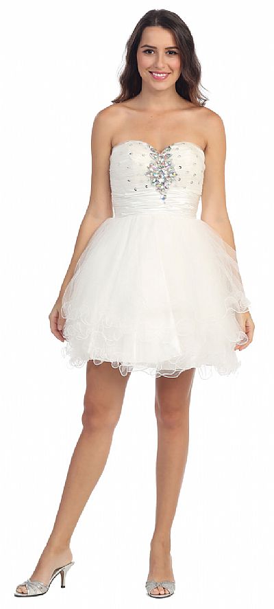 Strapless Rhinestones Bust Short Prom Party Dress. Sweetheart neck has rhinestones floral pattern in middle & single scattered ones on the rest of the bust. Shirred satin waistband with ruffled hem tulle making tiers at the skirt giving the dress a flirty look. Lace-up straps at the back with zipper closure also. Imported.