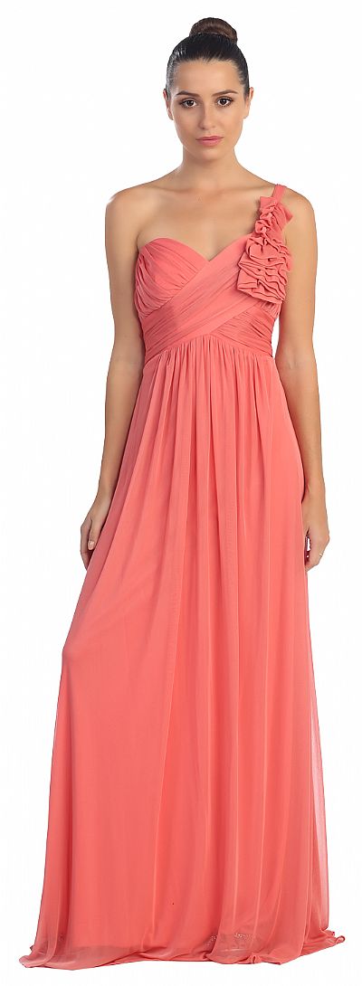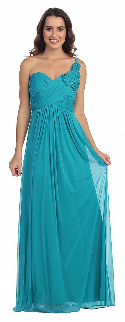 One Shoulder Ruched Bust Long Formal Bridesmaid Dress. Crossed shape shirring at bust with pleated floral accent at the shoulder strap. Sweetheart neck dress is little gathered below the waist. Back zipper closure. Made in USA.
