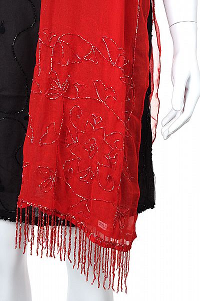 Hand beaded scarf with a floral print at bottom edges and a beaded line along border. Measurements: 20 inches(width) x 72 inches (length)