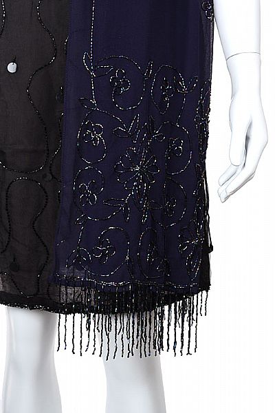 A multi-colored beaded shawl with a bottom edge floral print. Measurements: 21 inches (width) x 70 inches (length).