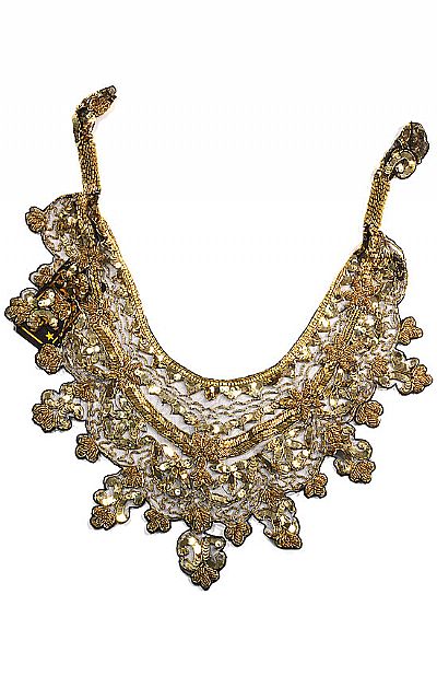 Hand beaded open collar scarf with a floral design. 100% Rayon netting.