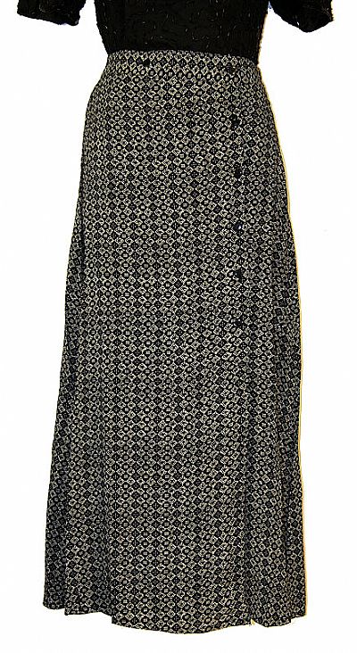Black & White printed polyester skirt with button closure on the waistband & also vertical buttons on one side of the skirt. Imported. The skirt has a waist of 34-35 inches & the length is 38 inches.