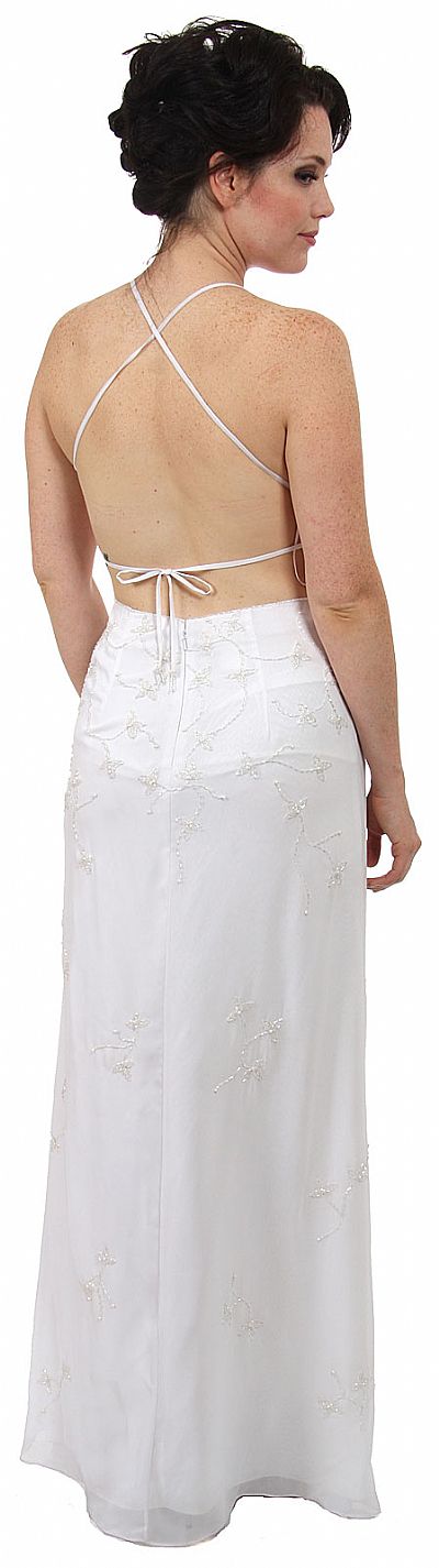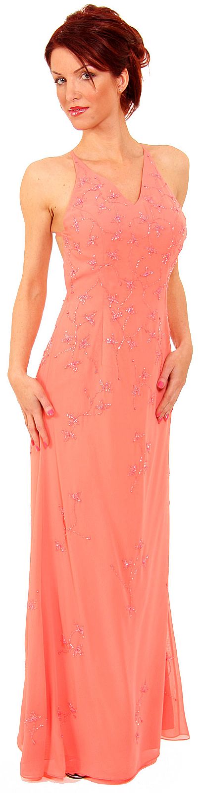 Beaded dress in floral and stem patterns; open back. Poly chiffon with polyester lining.